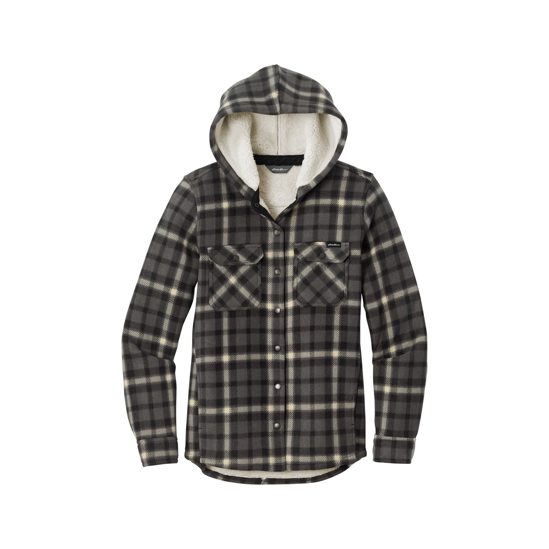 Whether you're spending time inside or outside in cool temps, the high-pile fleece interior of these rugged-looking shirt jacs will keep you warm. Eddie Bauer logo snap-front closure and snap-close chest pockets. Handwarmer pockets. Eddie Bauer woven label at left chest pocket. Two-piece hood. Made of 10.3-ounce, 100% polyester microfleece bonded with 100% polyester high-pile fleece interior. 100% polyester woven details.