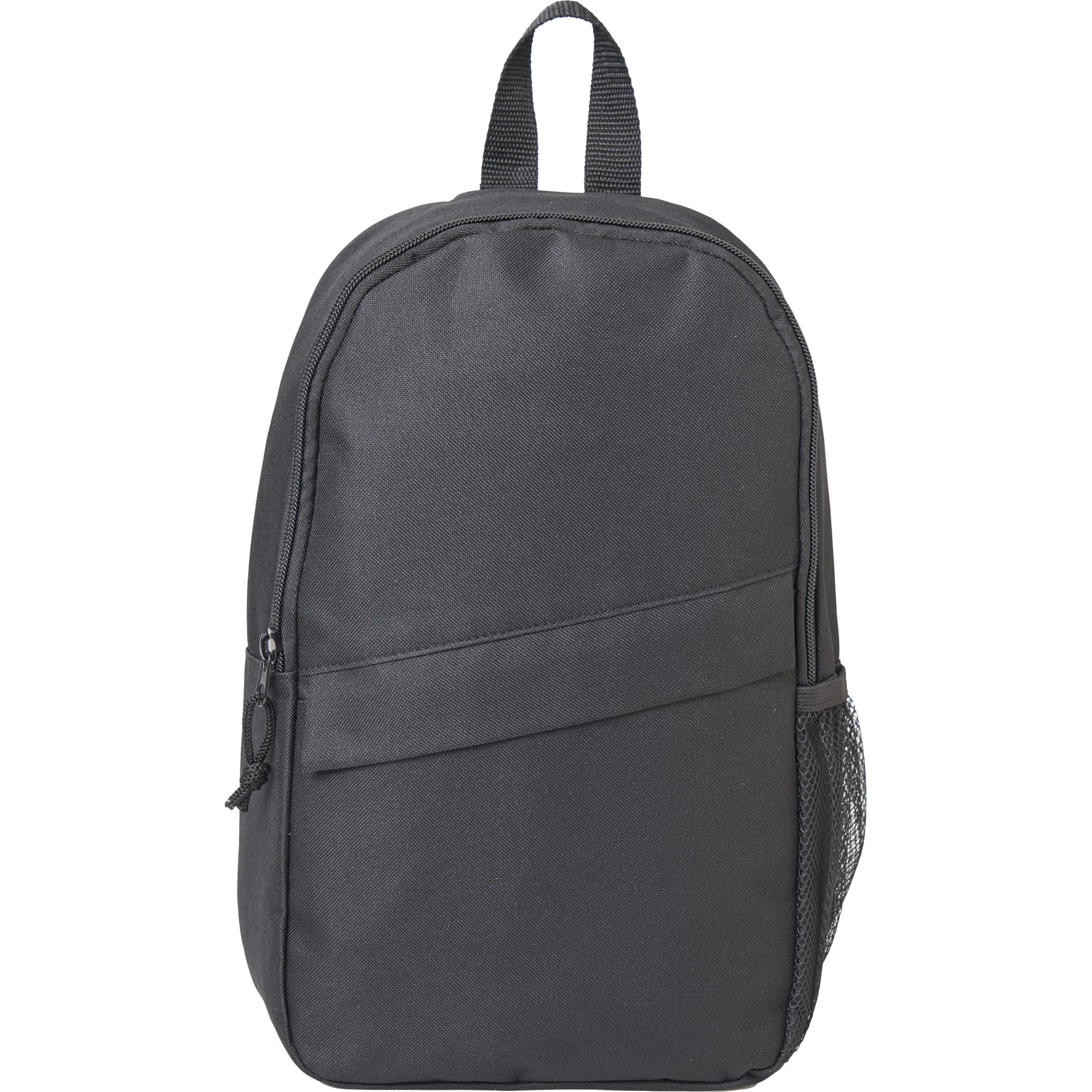 Sling backpack with one strap, front pocket, and side water bottle pocket.